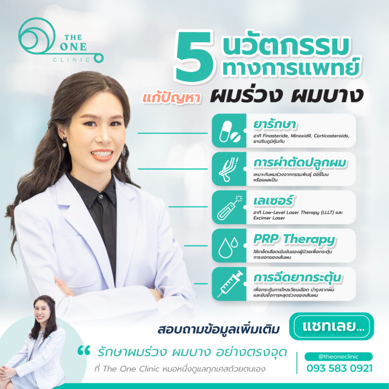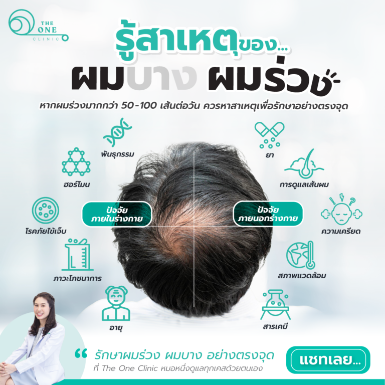- The One Clinic ให้บริการรักษาผมร่วงแบบครบวงจร ด้วยโปรแกรม Hair Multiplex ที่ผสานการฉีดยา เลเซอร์ และการบำรุงเส้นผมโดยแพทย์เฉพาะทาง หากผมร่วงผิดปกติ ควรปรึกษาแพทย์ทันที ติดต่อ Line: @theoneclinic หรือโทร. 093-5830921
