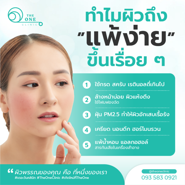 ผิวแพ้ง่ายหรือ Sensitive Skin เป็นหนึ่งในปัญหาผิวที่หลายคนต้องเผชิญในปัจจุบัน โดยเฉพาะในยุคที่ต้องเจอกับมลภาวะ แสงแดด ฝุ่น PM2.5 สารเคมีในสกินแคร์ รวมถึงความเครียดและพฤติกรรมการใช้ชีวิตที่ไม่สมดุล ทำให้ปัจจุบันผู้เข้ารับคำปรึกษาที่ The One Clinic ส่วนใหญ่มีอาการ “ผิวแพ้ง่ายขึ้นเรื่อย ๆ” ทั้งที่ก่อนหน้านี้ผิวปกติดี